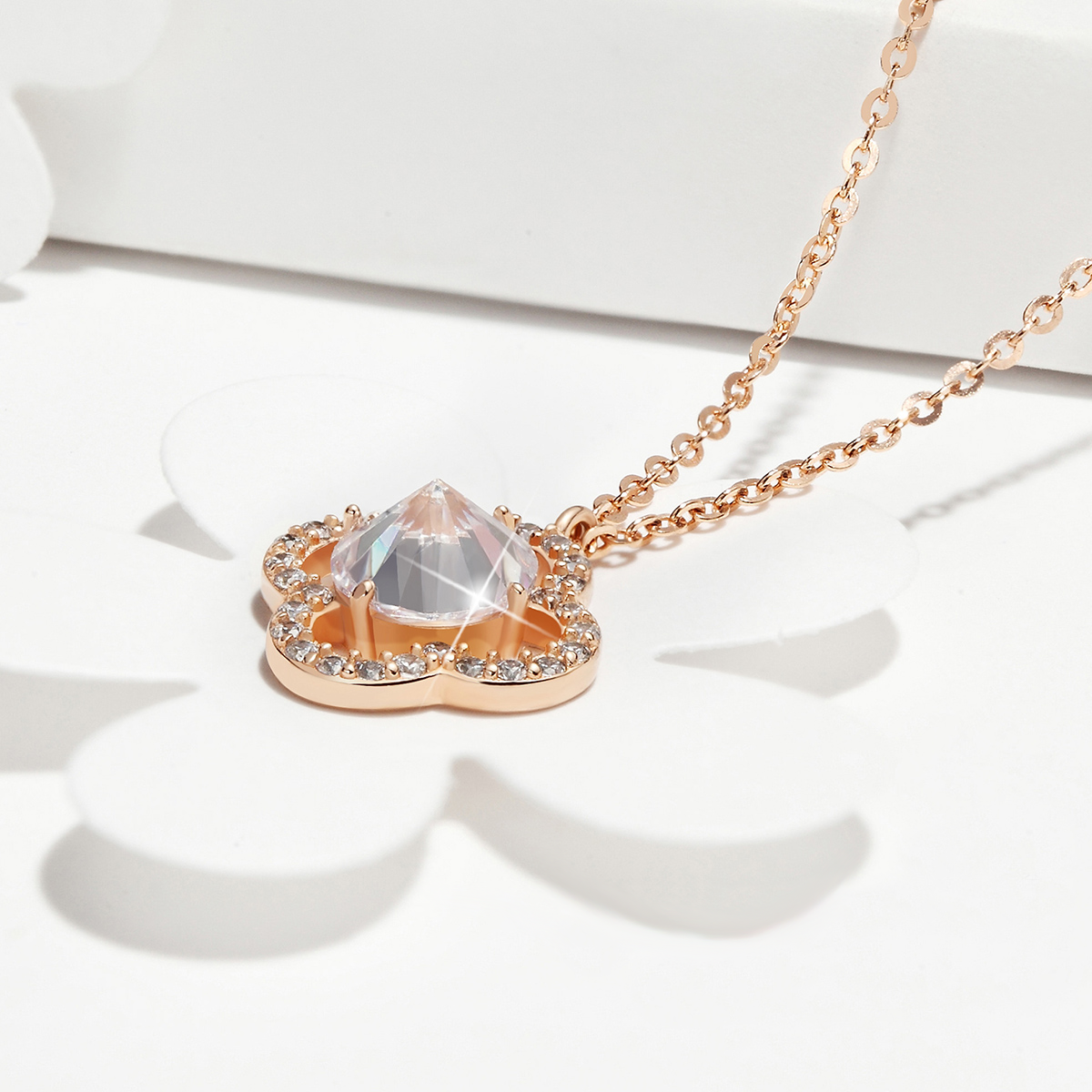 This necklace is inspired by the four-leaf clover which signify lucky and blessing. Using the shinning stones to decorate the leaf makes the perfect balance between elegant and beauty. Crafted in sterling silver, this necklace pedant showcases a round cut stone standing in the four-prong setting to attract eye. A shimmering token of your affection, this necklace is certain to be appreciated.