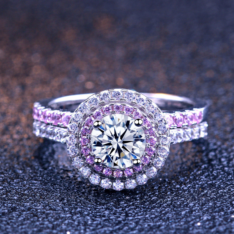 This brilliant piece says it all, embellished roundabout with round cut stones, what better way is there for you to tell her you love her? This sterling silver engagement ring features an AAAAA cubic zirconia diamond-white round cut center stone resting on a four-pronged bezel, and surrounded a row of pink round cut stones as the inner row, and further by another row of diamond-white round cut small stones, these rows extend downward onto the upper shank for an all-round glitter, it also features a band of 925 sterling silver, finely plated with white gold. Adorn her fingers with this sparkle of love.