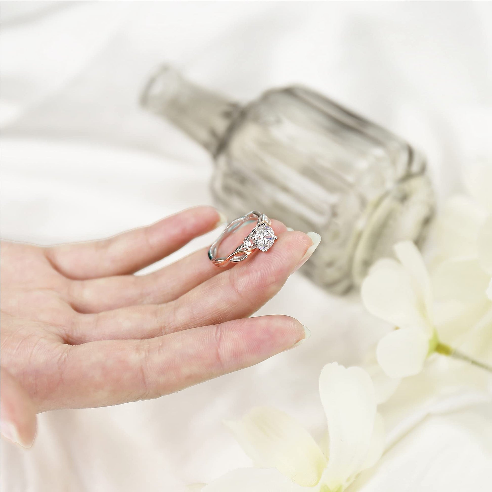 Classic 3 stone set ring with twisted rose gold plated and white gold plated branches,making the whole promise ring look elegant,unique and full of design.7mm center CZ stone and 2mm small CZ stones.Ring band width:1.5mm.
