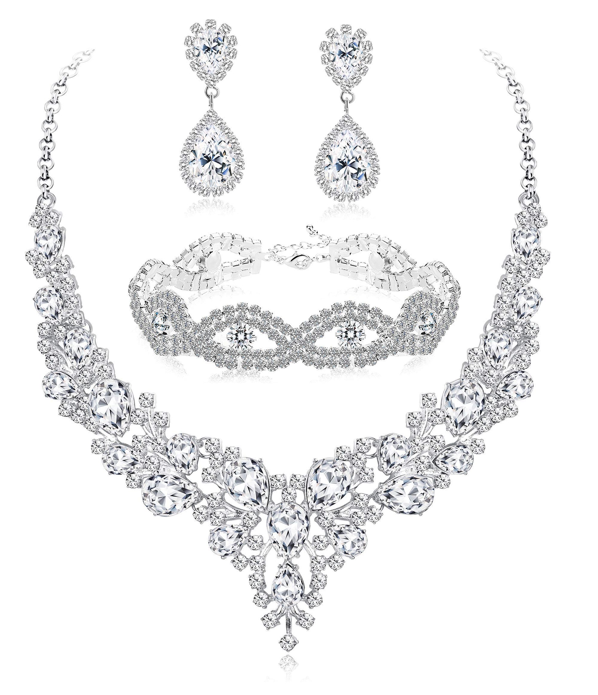 【💎 WEDDING JEWELRY SETS】:Dainty bridal jewelry set inlaid with rhinestone contains 1 shiny prom necklace,1 teardrop bracelet and 1 pair of earrings are best choice when you are going to a wedding or banquet,the sparkling jewelry set can make you stand out in the crowd