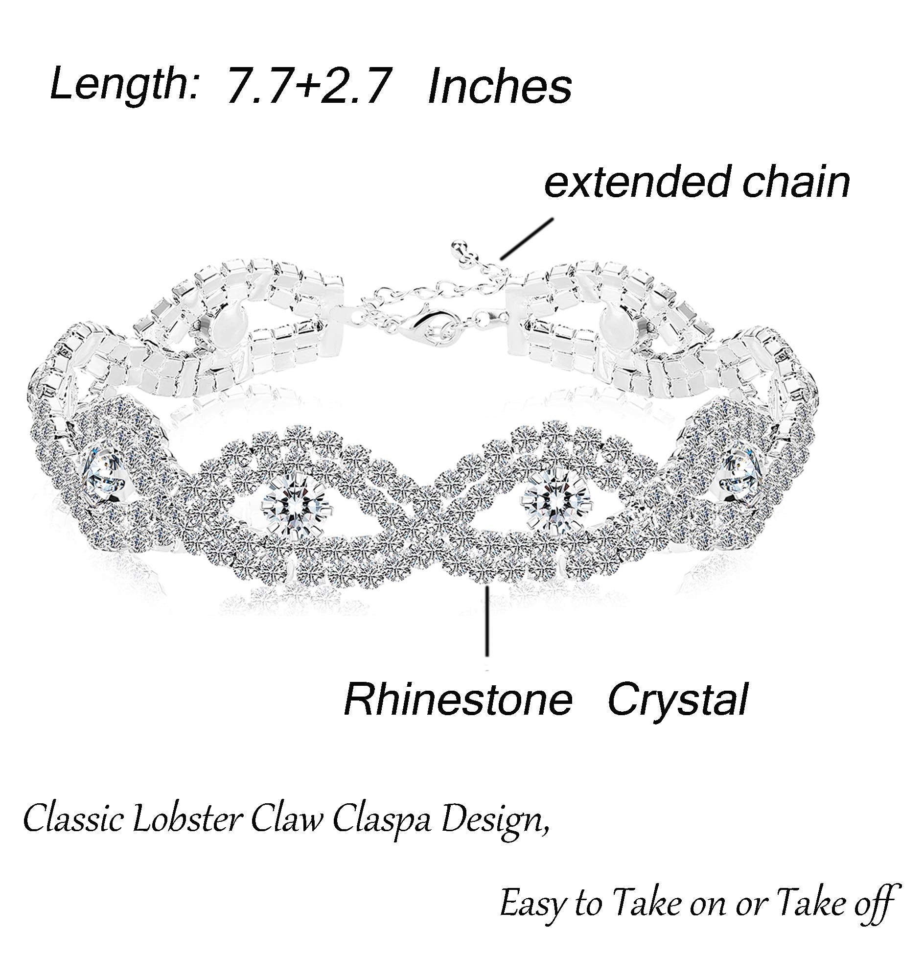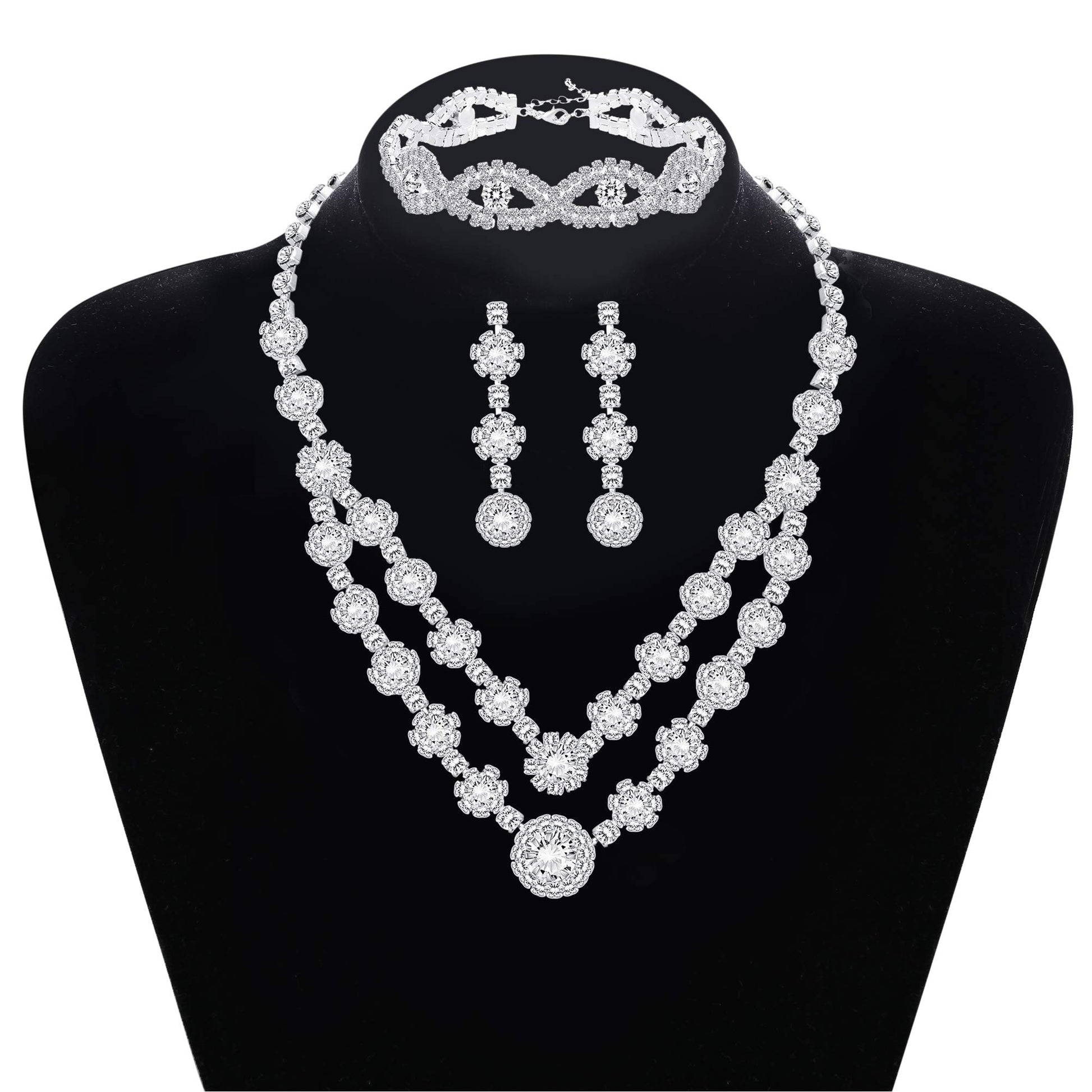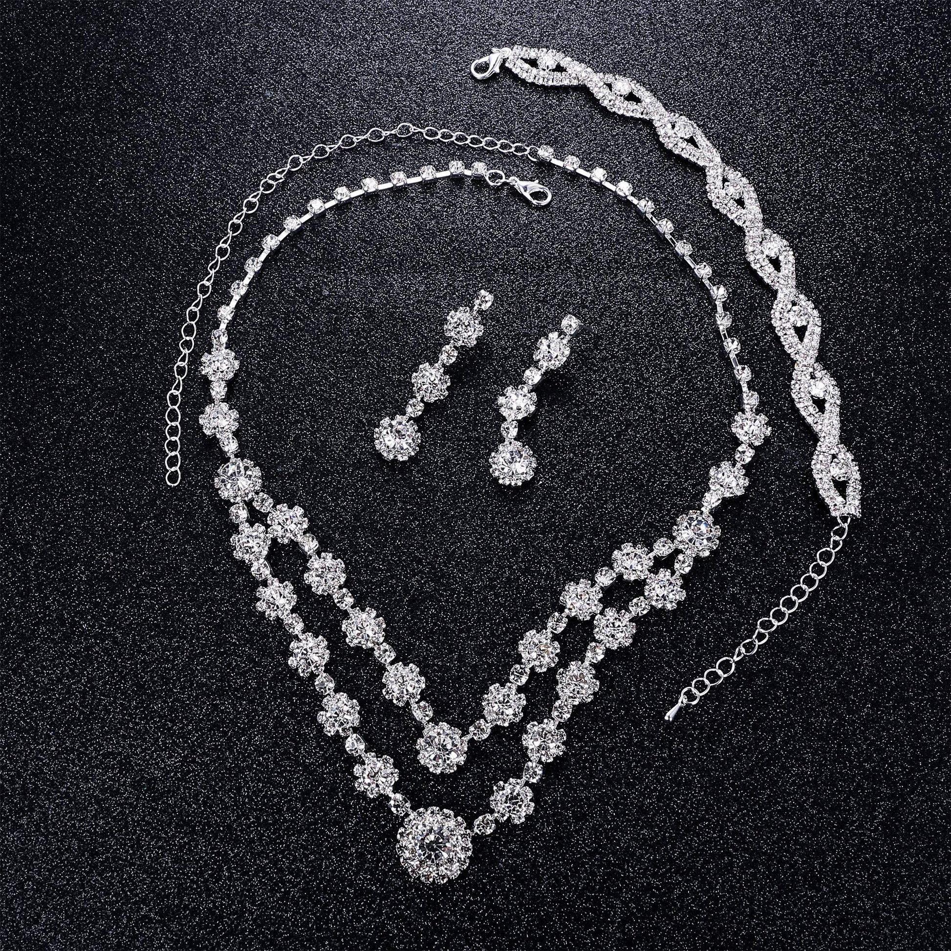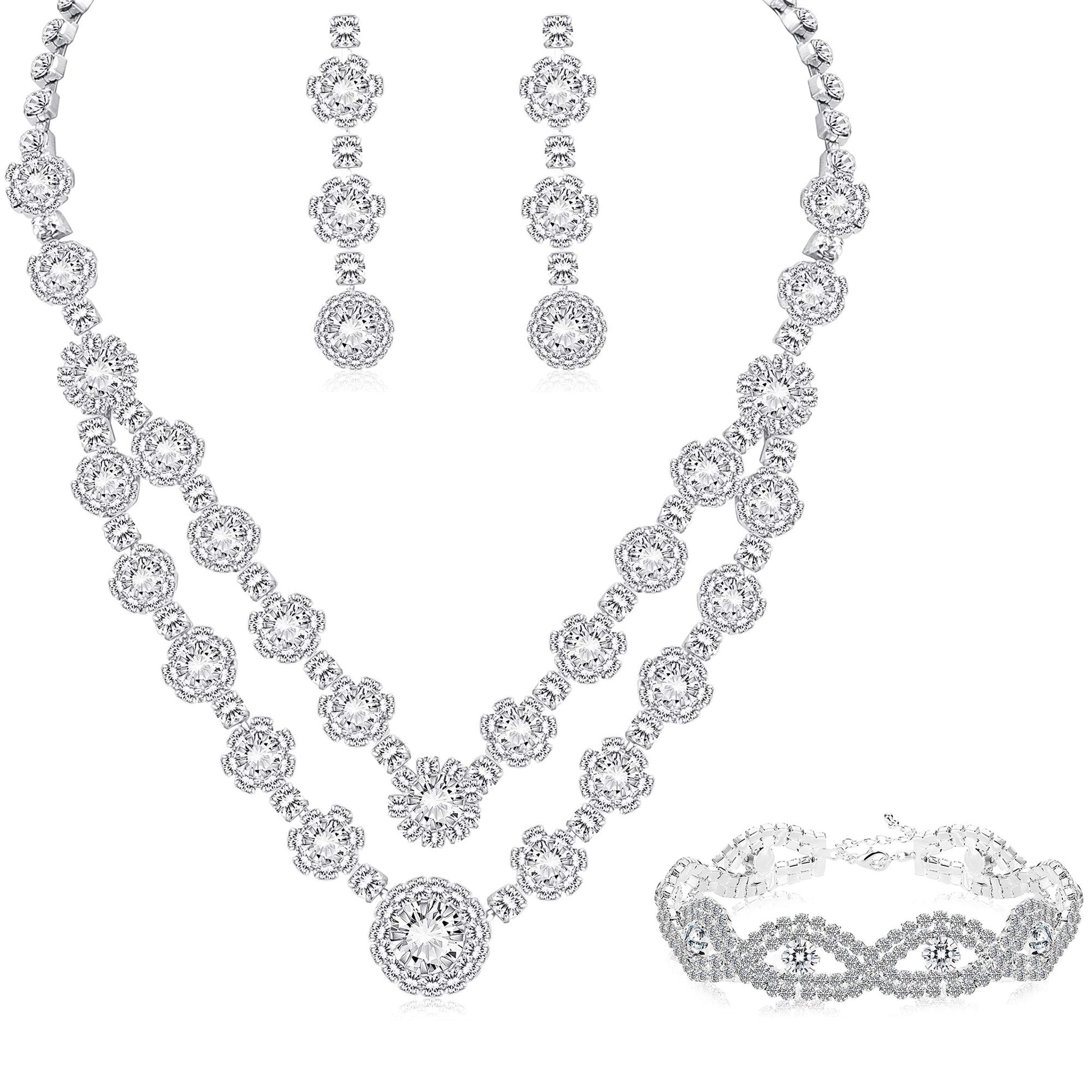Silver Jewelry for Women-Choker Necklace Jewelry Sets.2-Row Rhinestone Necklace Link Bracelet Flower Dangle Earrings, With a Fabulous Design and Solid Construction.The Classic Jewelry Collection.Can be Worn with Classy Casual with Formal Attire or Wedding Dress, Never Goes out of Style.