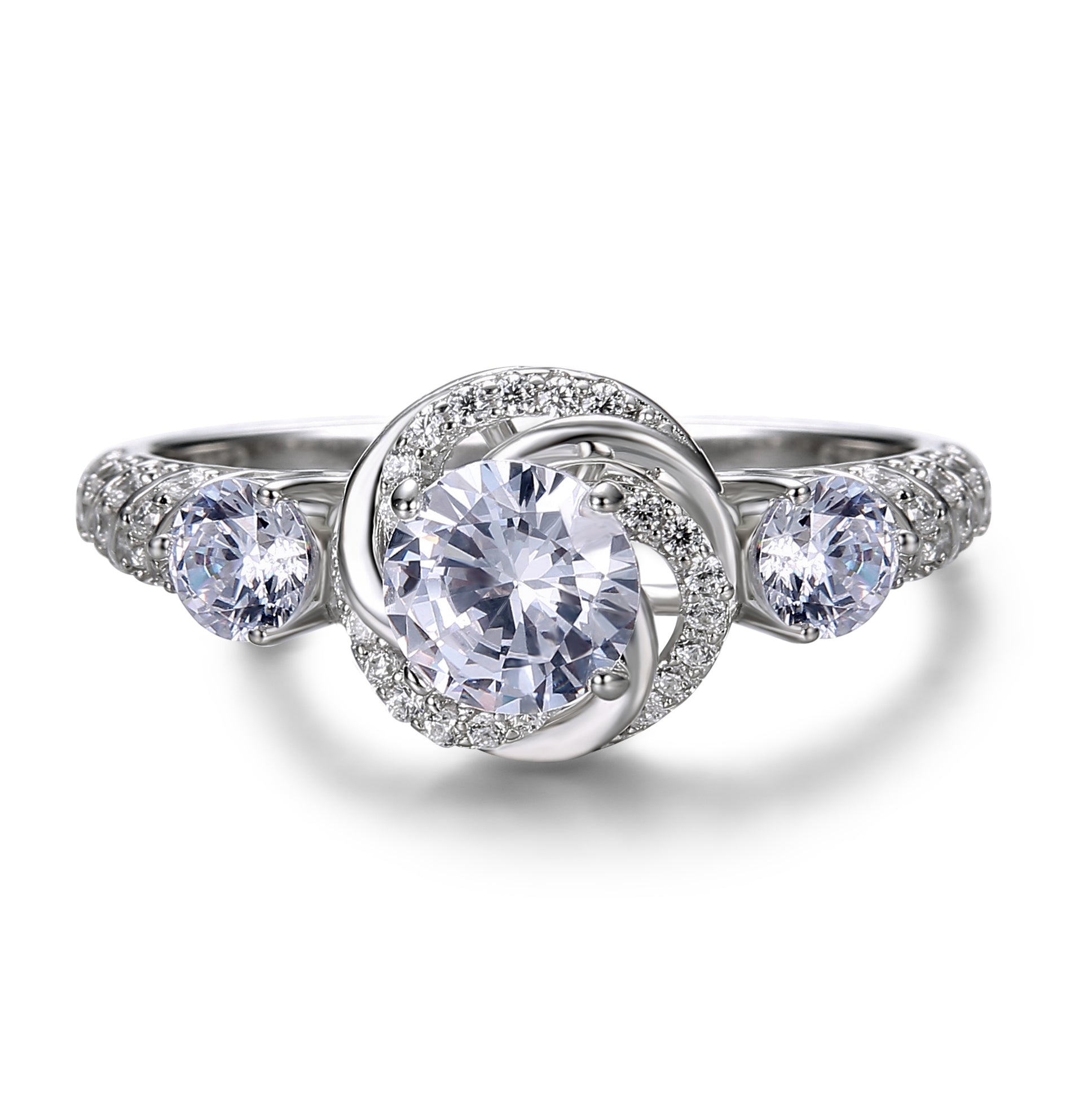 What better way to pop the big question? The Floral Halo Round Cut Sterling Silver engagement ring brings an amazing glimmer to the table – a perfect glow. This exquisite piece of perfect crafting showcases a diamond-white round cut center stone of 2.5ct carat weight surrounded by a swirling frame lined with smaller round stones also diamond-white of 1.97ct carat weight each; with more sparkles up the shank from even yet smaller stones swirled around the band. With the diamond cut appropriately and at an accurate angle, the crown on this one traps the rays of the sun to give you a shimmer that drives your love home.