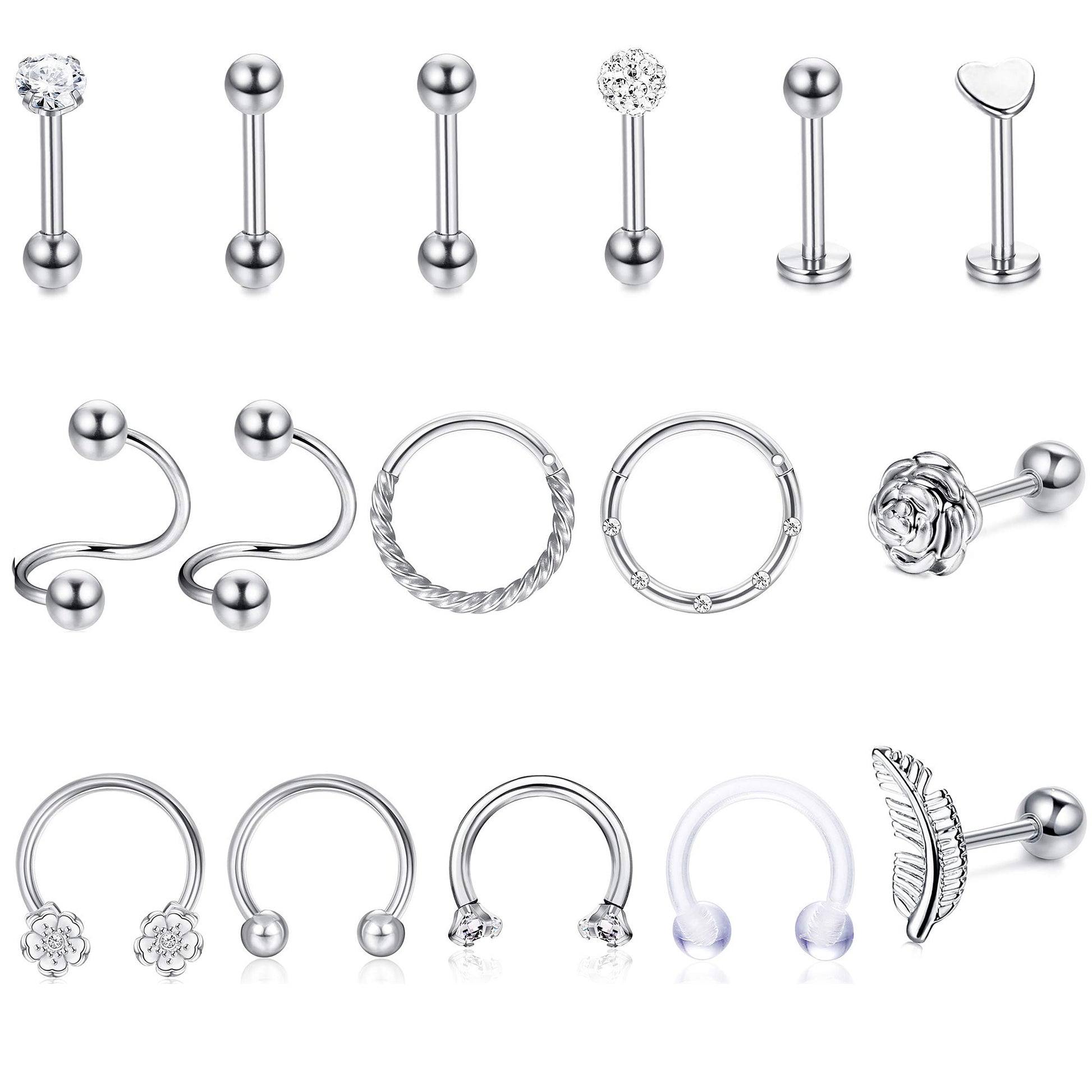 【Piercing Earrings Studs】Our piercing jewelry comes with 16 Pcs tragus piercing, including spiral cartilage earrings, horseshoe barbell earrings, earring studs(rose CZ feather earrings), clicker hoop earrings. Different style piercing earrings are set to add more special and charm to your daily outfit.