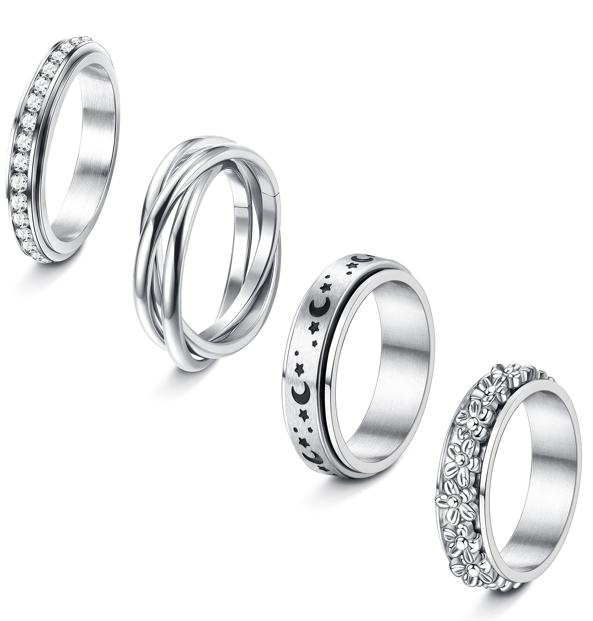 Diamday 4 Pcs Acier Inoxydable Fidget Band Anneaux pour Femmes Hommes Spinner Anneaux Fleur Lune Étoile Cool Anneaux Anti-Stress Mariage Promesse Anneaux Ensemble