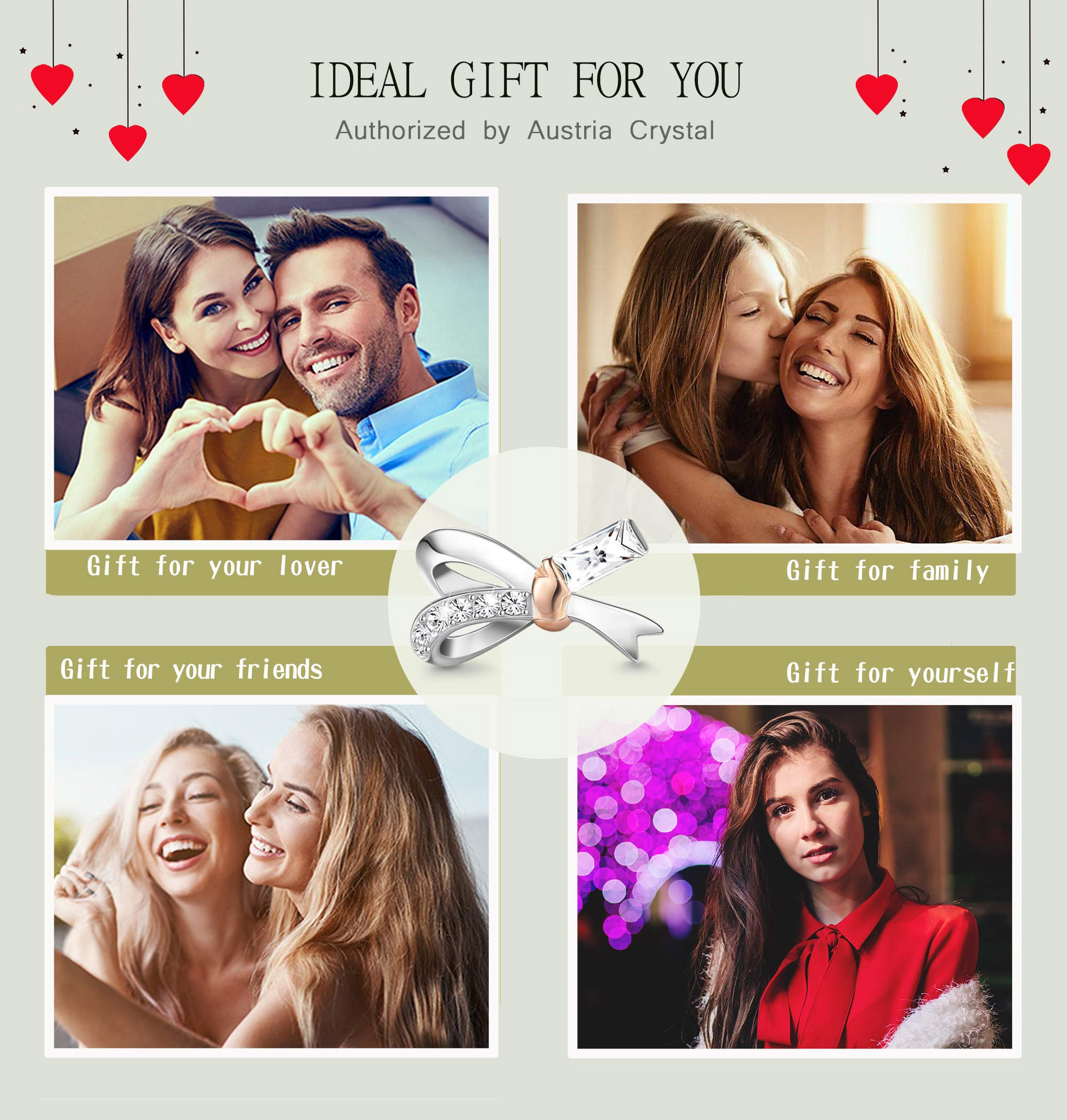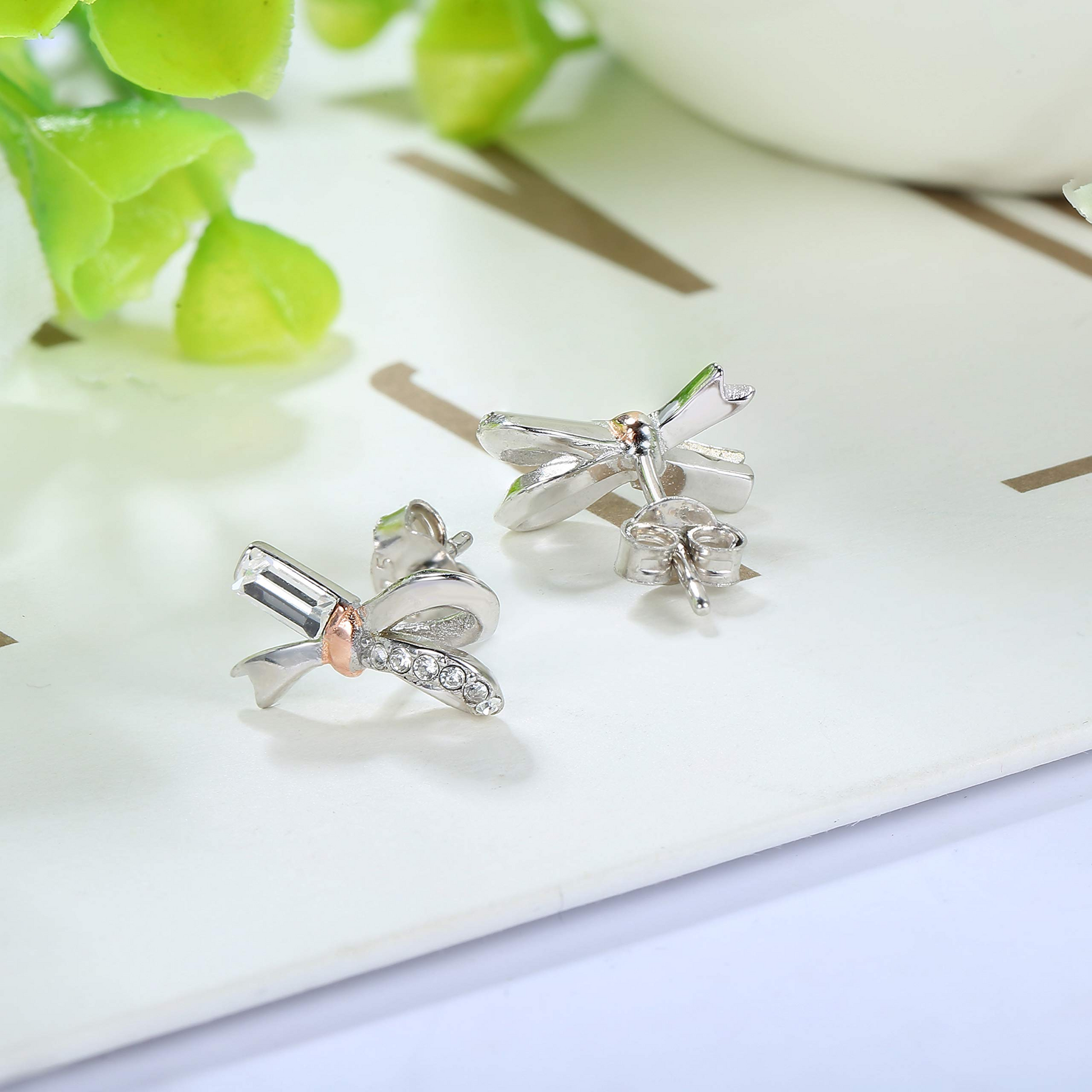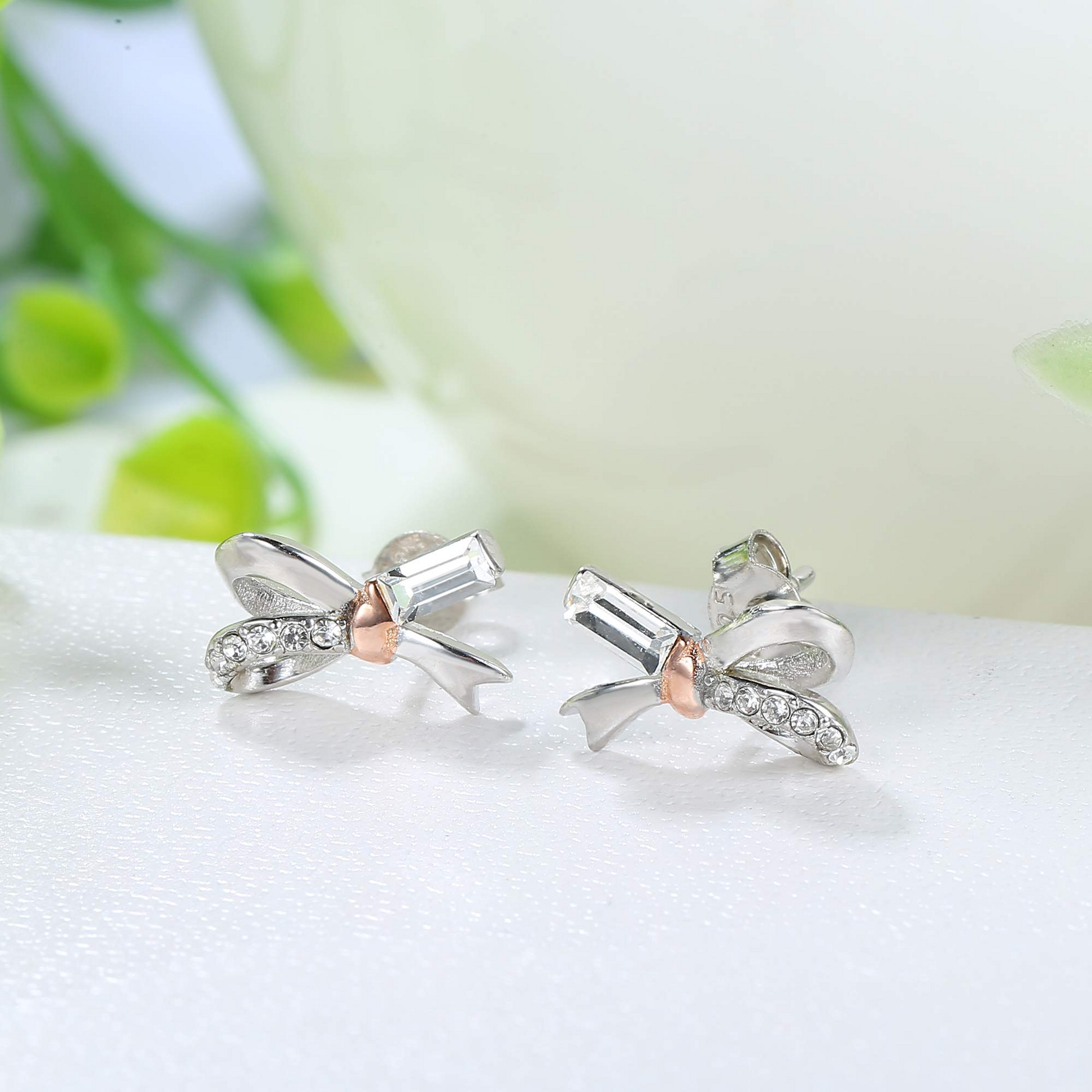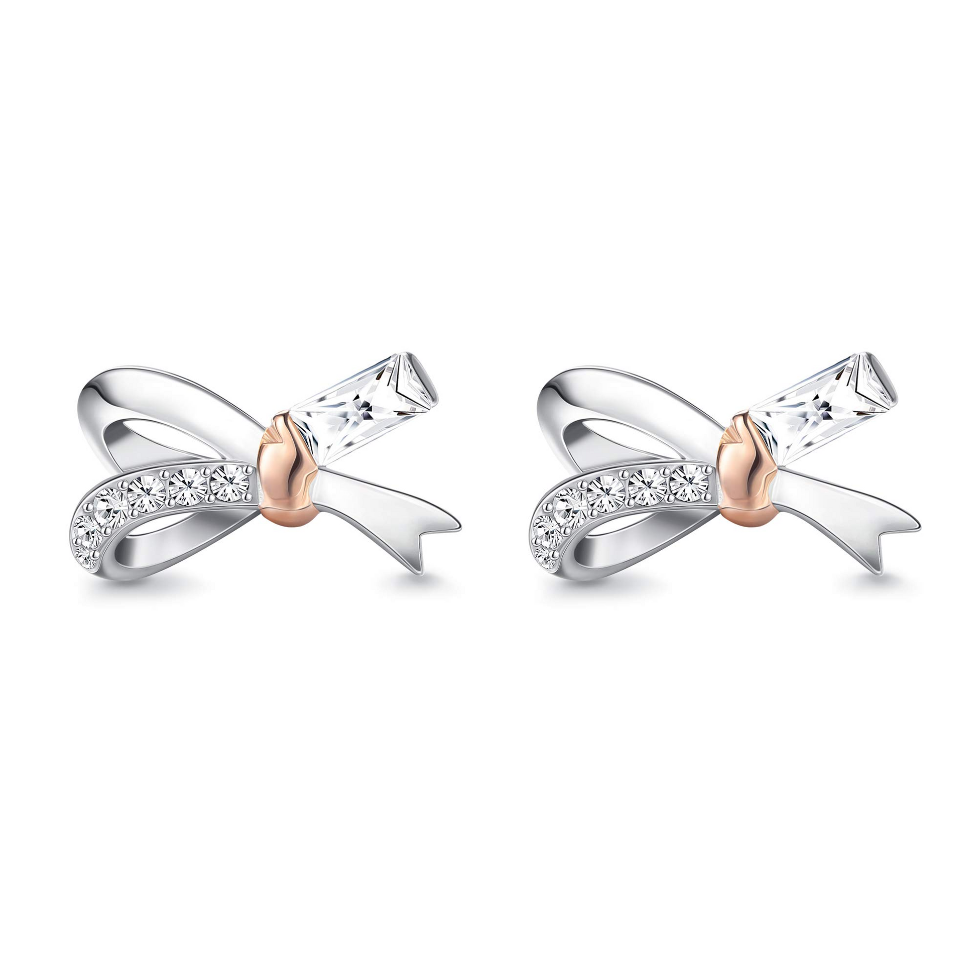 Two-tone rose gold sterling silver stud earrings, the casual lines outline a simple bow,With 10 sparkling Austrian crystals, the sweet style is coming. Use the bow style to tie the heart of every cute and lovely woman,let you restore the full girly feeling.
