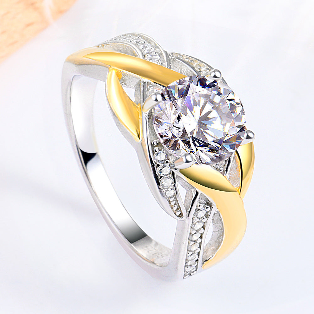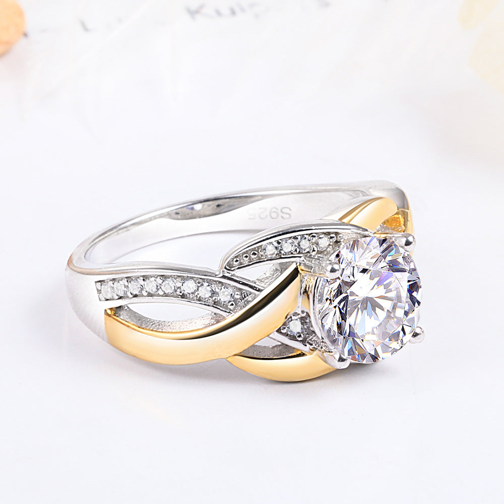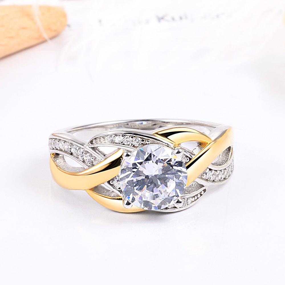 Stunning and sparkling, this ring set will capture her heart at first sight. Crafted in two tone sterling silver, the engagement ring features a glittering round-cut center stone surrounded by a gold tone band. On your wedding day, speak your vows as you slip the coordinating wedding band on her waiting finger.